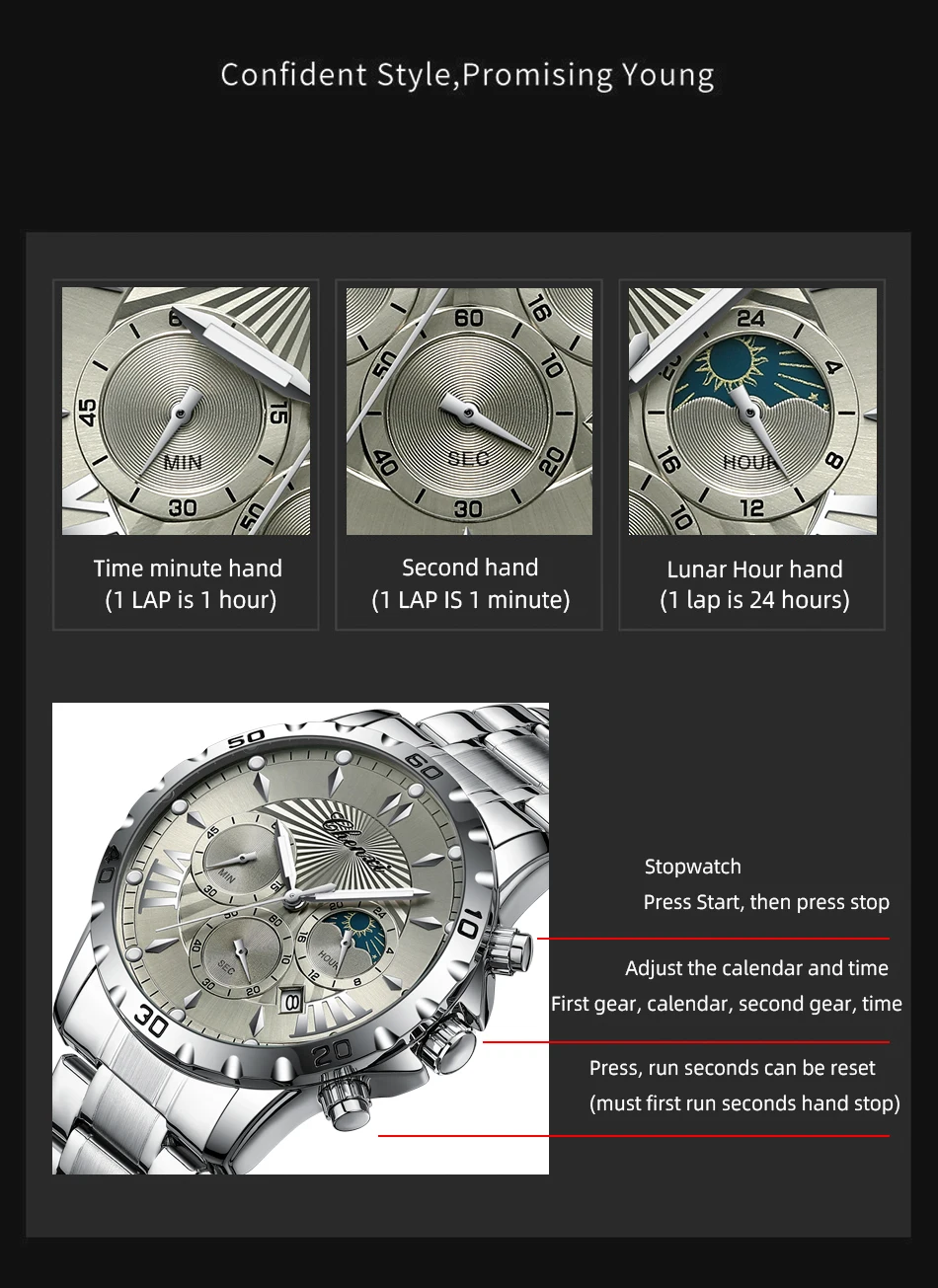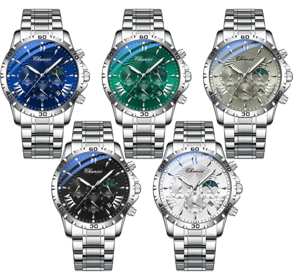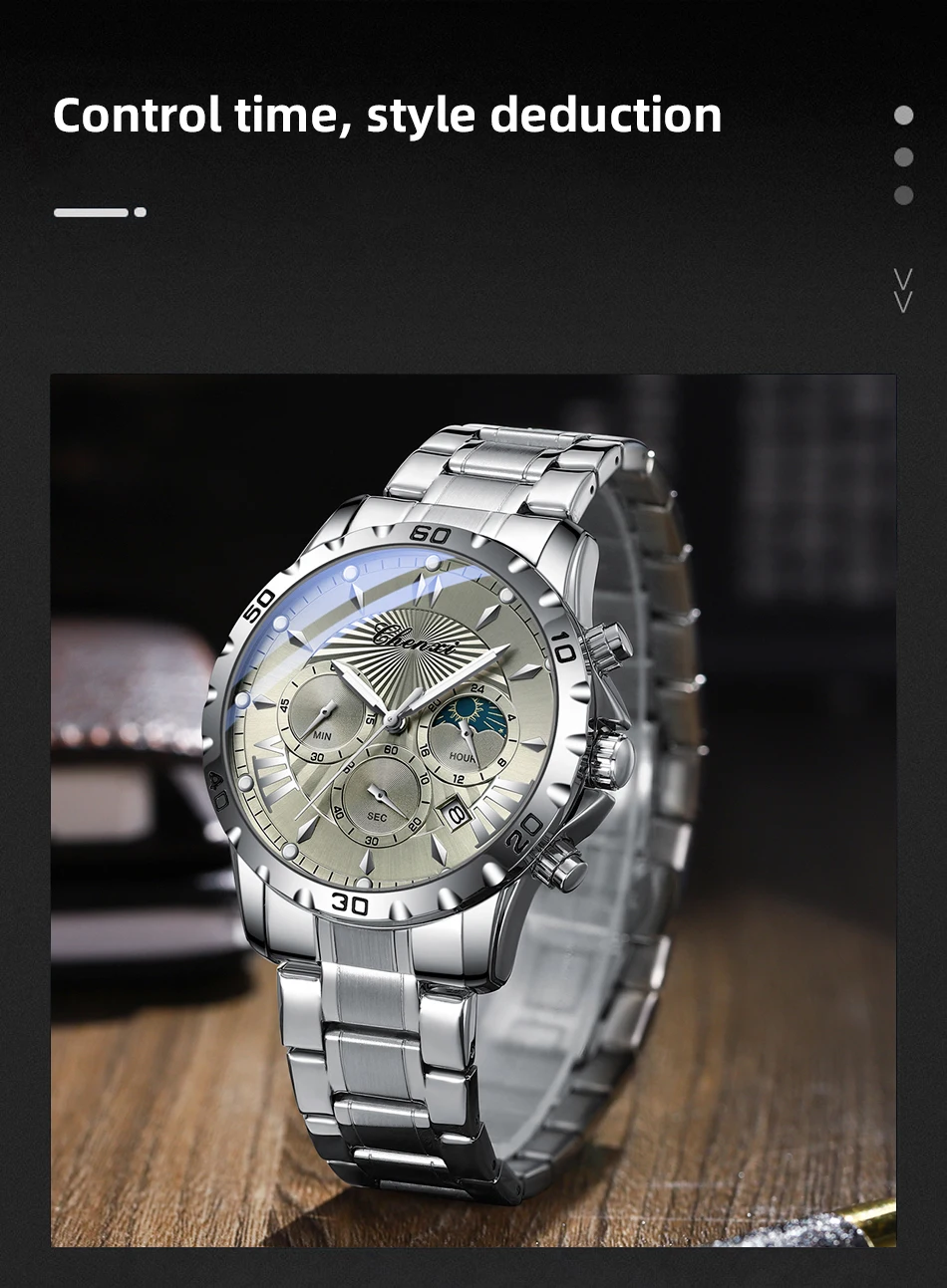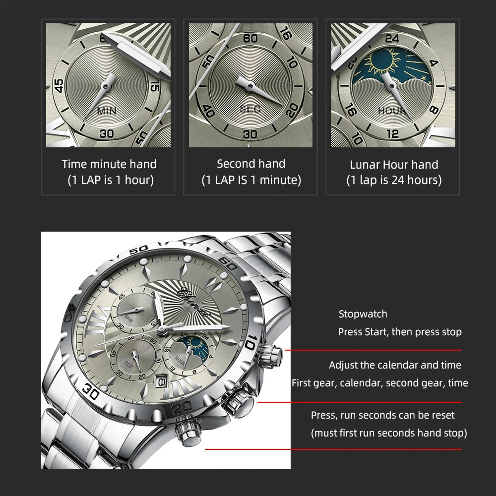 שעון צלילה כונוגרפי לגברים בעיצב של ירח/שמש ב-8 צבעים לבחירה מחוגים זוהרים